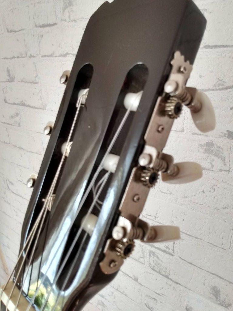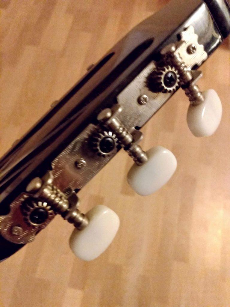 Met behulp van een donorgitaar, waarvan de hals krom was en ik gratis gekregen had van een collega, de stemmechanieken vervangen.