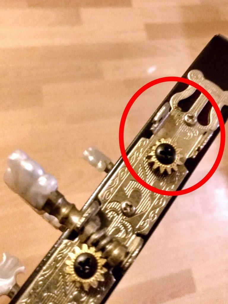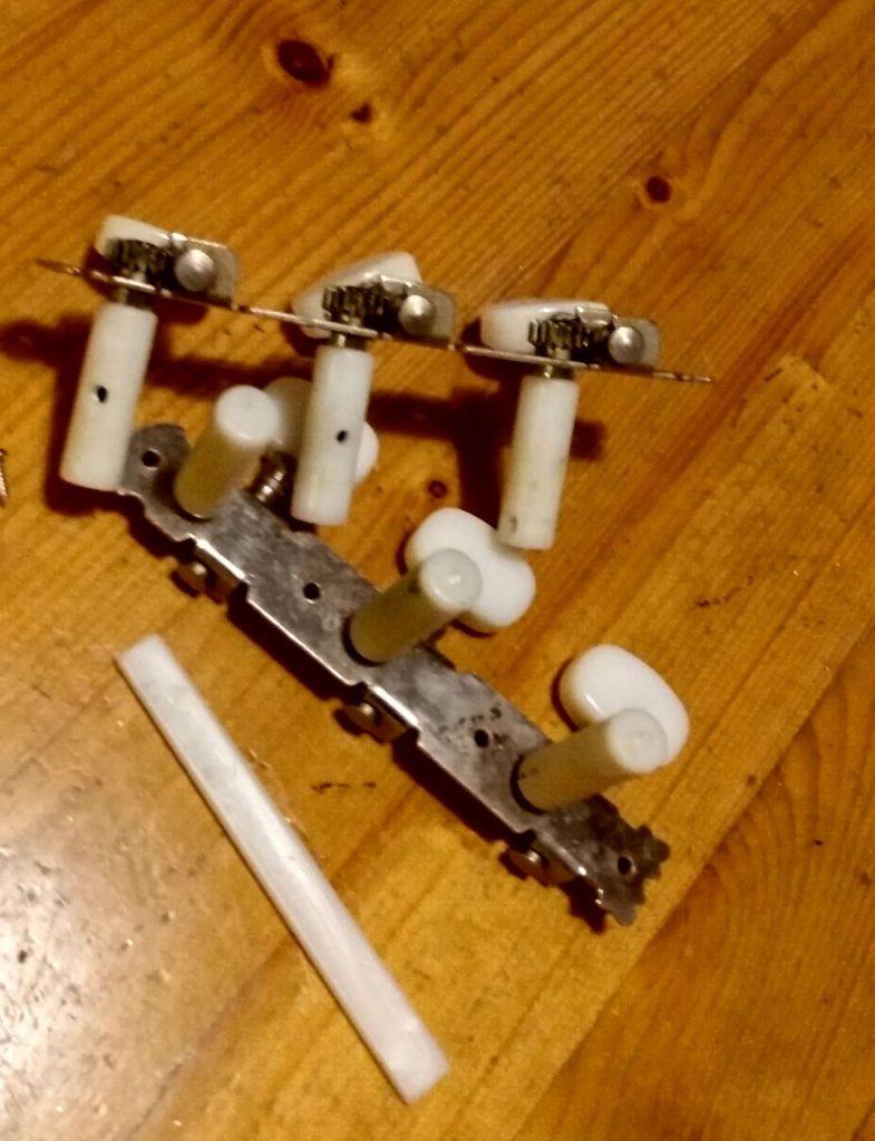 Na het verwijderen van de snaren kun je de stemmechanieken loshalen. In dit geval moesten ze er allemaal af omdat één vervangen niet mogelijk was gezien de constructie (afbeelding hier boven, het kapotte mechaniek waarvan een aantal tandjes waren afgebroken).