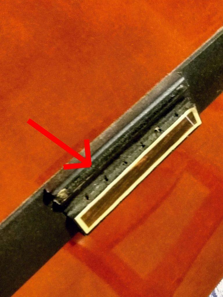 Na verwijderen van de snaren constateerde ik dat het brugzadel ook niet erg fris meer was. Dus ook die moest vervangen worden. Dat is simpel; die zitten over het algemeen gewoon los in de brug.