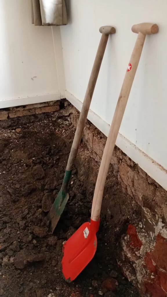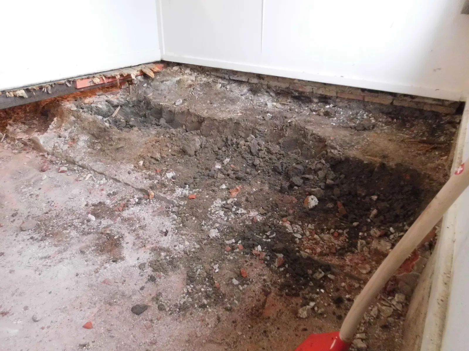 Na de sloop van de vloer en de kelder moest er grond worden weggeschept. Aangezien je niet met goed fatsoen met een kruiwagen in de ruimte kon komen alle puin en grond afvoeren met emmers. Het was een paar dagen scheppen en sjouwen..