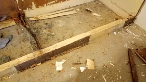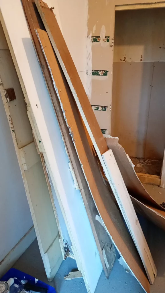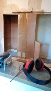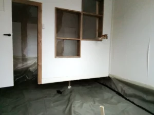 In de ruimte was nog een grote kastenwand die er uit moest. Dat leverde zo’n 3 vierkante meter extra ruimte op waardoor de ruimte (een slaapkamer met een klein kamertje er achter) nu bestaat uit twee volwaardige (slaap/studeer)kamers. In die kastenwanden zat al een betonvloertje maar het ene stuk was hoger dan het andere. Dus ook dat gedeeltelijk gesloopt en zelf met wat beton weer uitgevlakt.