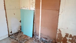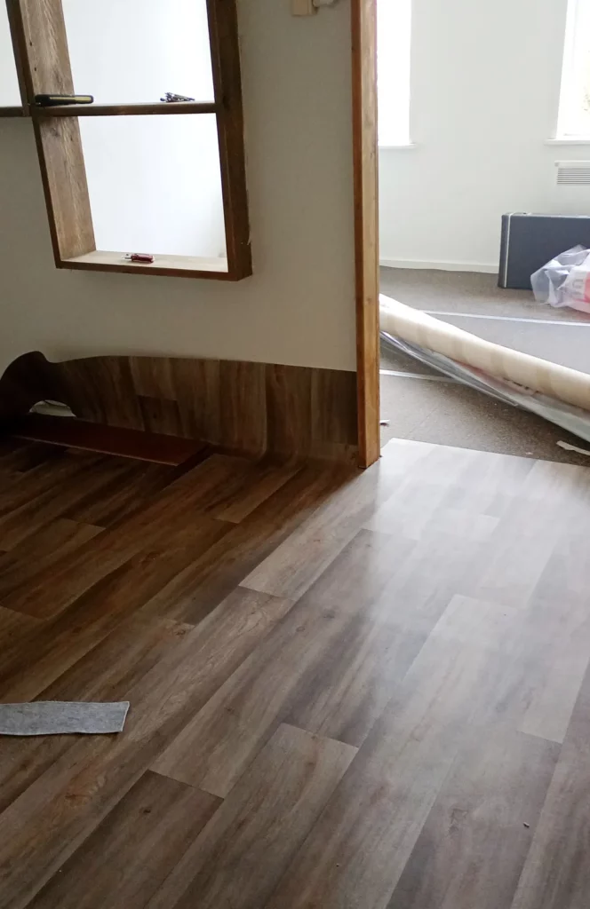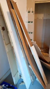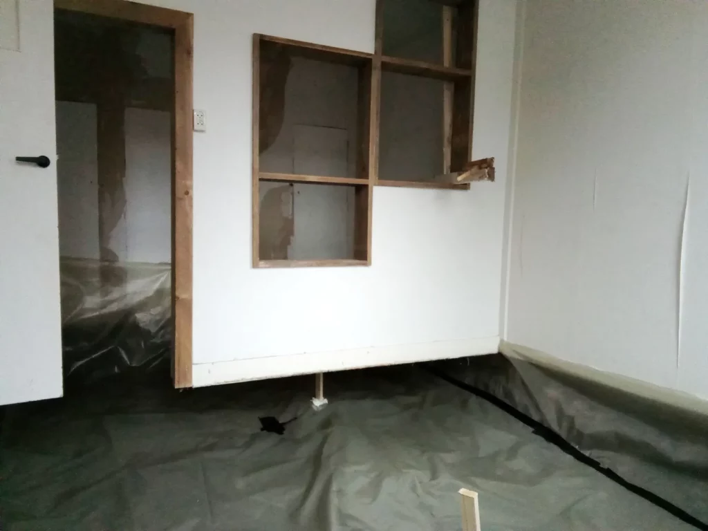 Daarna de achterwand van (vochtbestendig) gipsplaat voorzien, naden vullen, schilderen van alle wanden en plafonds en tot slot vinyl gelegd.