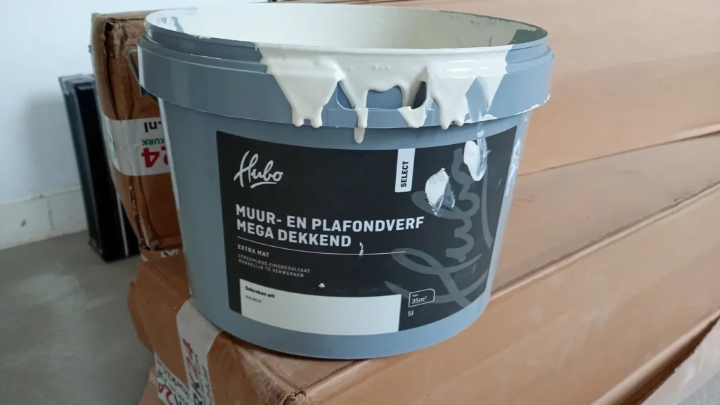 Er is gekozen voor vochtbestendig gipsplaat omdat deze plaatjes mooi stevig zijn, op voorraad waren bij de plaatselijke HUBO, handig formaat hadden (in verband met transport!) en onder het motto “better safe than sorry” omdat aan de andere kant van de muur de badkamer zit. Je weet immers nooit of de muren toch niet een beetje vochtdoorslag hebben bij zo’n oude woning?